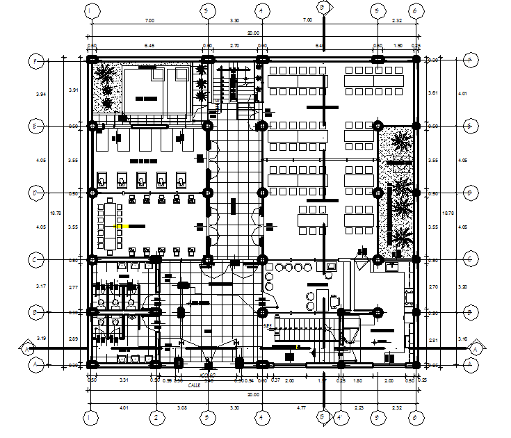Working commercial plan detail dwg file, Working commercial plan detail with dimension detail, naming detail, section line detail, plant and tree detail, furniture detail with door, table, toilet detail, center line plan detail numbering detail, etc.