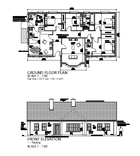 Ground Floor Plan and Front Elevation with Complete House Detailing