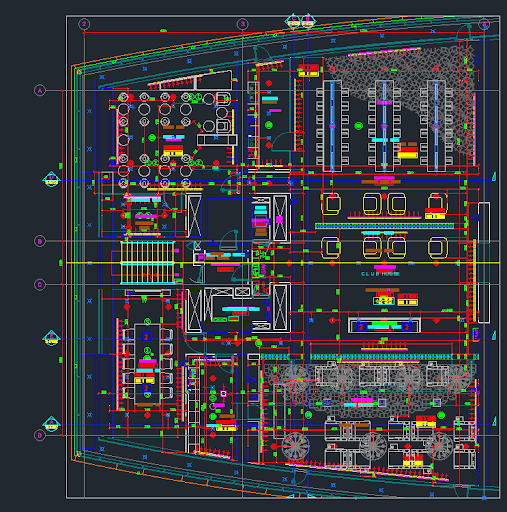 This AutoCAD DWG file presents a complete and detailed architectural design of a modern club house, including full floor plans, sectional drawings, and internal spatial layouts. The plan displays clearly defined activity zones such as lounges, multipurpose rooms, seating areas, service passages, restrooms, and recreational spaces. Each room layout is drafted with precise dimensions, construction lines, column positions, wall thicknesses, and furniture arrangements to support accurate implementation. The curved building footprint, structural grid alignment, entrance positioning, and indoor circulation patterns are illustrated for better planning and project coordination. The file also includes material indications, door–window placements, landscaping elements, and essential service routes for mechanical and electrical planning.