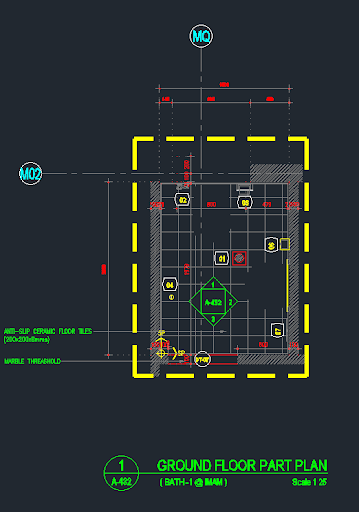 This AutoCAD bathroom detail file provides a complete set of drawings, including the plan, elevation, and sectional views essential for accurate bathroom layout and construction execution. The plan view displays precise fixture positioning such as WC, wash basin, shower area, exhaust locations, and plumbing points. Tile layout, floor gradients, water outlet positions, and drainage systems are clearly marked to ensure proper installation and compliance with building standards. The drawing also includes material annotations, fixture symbols, and wall dimension details to simplify interpretation for designers and contractors.