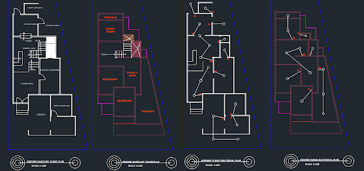 This duplex home DWG file provides a complete architectural package designed in AutoCAD, showcasing every essential component required for accurate residential planning. The drawing includes detailed floor plans placed on an angular plot layout, clearly presenting room arrangements, circulation paths, and dimensional annotations. Multiple presentation plans highlight the internal zoning and overall spatial configuration. Electrical layouts are shown with switches, wiring routes, fixture points, and distribution planning. The file also contains layered roof designs, precise staircase detailing, and furniture placement to help visualize the home’s interior functionality.