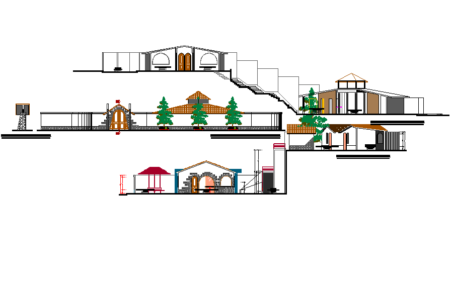 Front elevation and side elevation detail dwg file, Front elevation and side elevation detail with naming detail, landscaping both side tree detail, elevation detail with door and window detail, etc.
