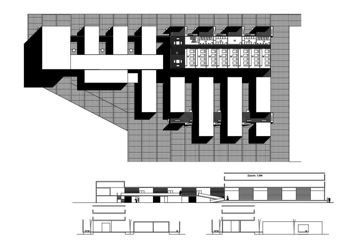 Two flooring social center architecture project that includes a detailed view of front elevation, back elevation, structure details, staircase view, structural view, flooring view, wall design, terrace view and much more of social center details.