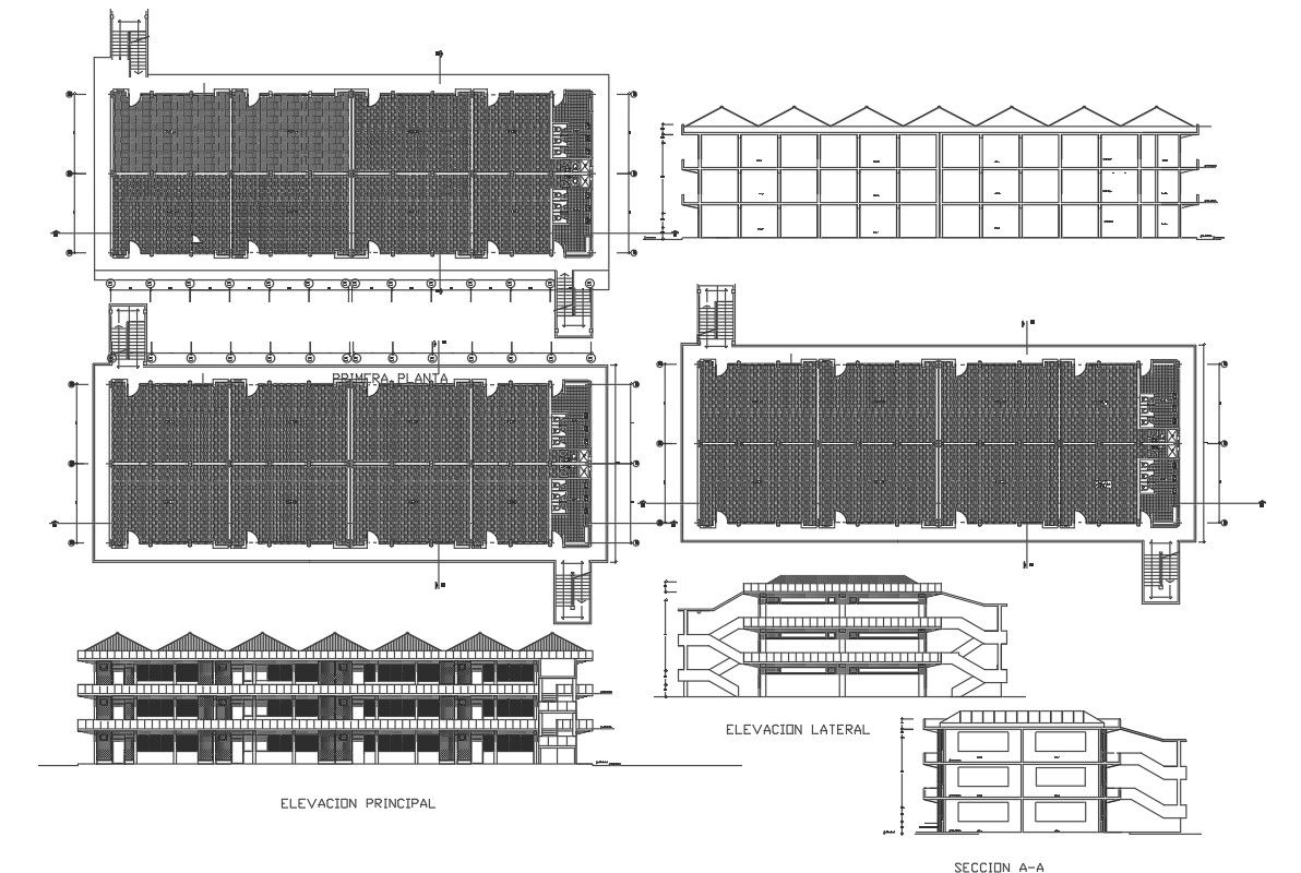 Plan, elevation and section detail dwg file, Plan, elevation and section detail with dimension detail, naming detail, center line plan detail with numbering detail, section detail with stair cutting detail, etc.