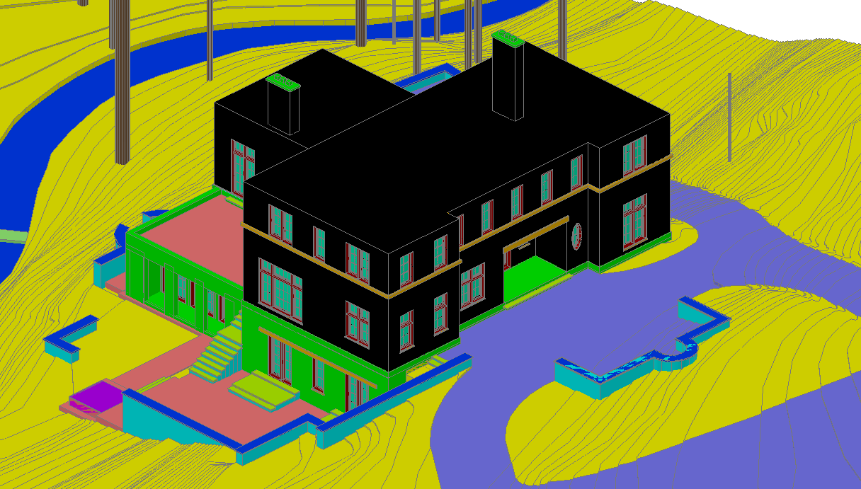 This 3D family residence DWG file presents a fully detailed architectural model designed for professional planning and visualization. The drawing includes a complete exterior massing of the house, detailed façade elements, window placements, terrace levels, and integrated landscape features. The site layout showcases contour lines, driveway connection, garden zoning, and outdoor circulation pathways. The model also highlights the swimming pool area, stepped access, boundary walls, and structural arrangements, giving users a precise understanding of the building’s form and elevation positioning.