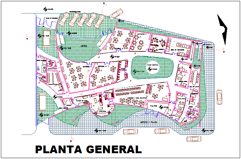 General plan of medical building of nursery dwg file in plan with wall,parking area,flooring