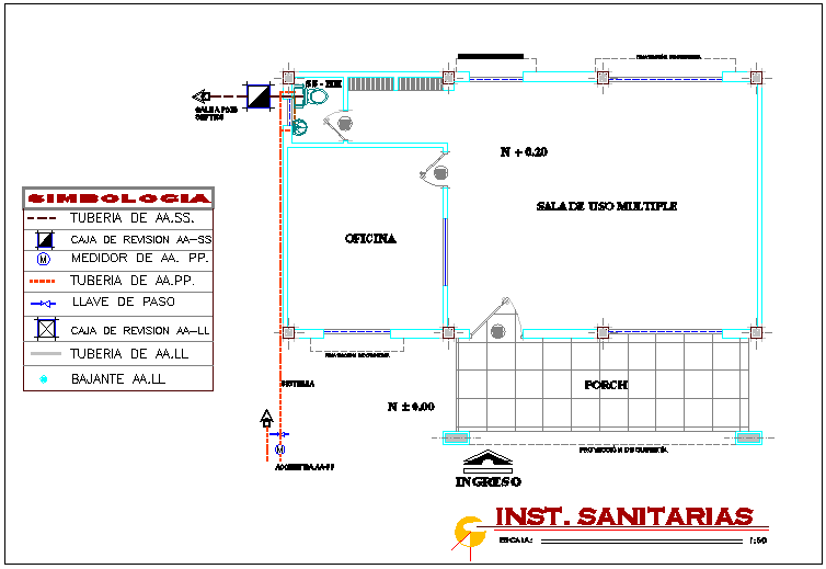 Sanitary view with its legend of communication office building dwg file in plan with office arera and multiple use room view,washing area with sanitary view and sanitary water line view with its legend.