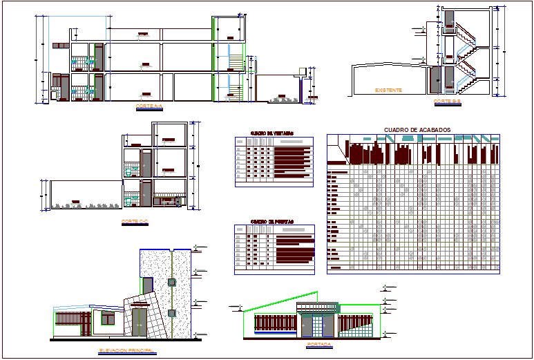 Local communal building elevation and section with door and window detail dwg file in elevation with floor,wall,door,window and section with floor,wall,balcony,stair,floor level and