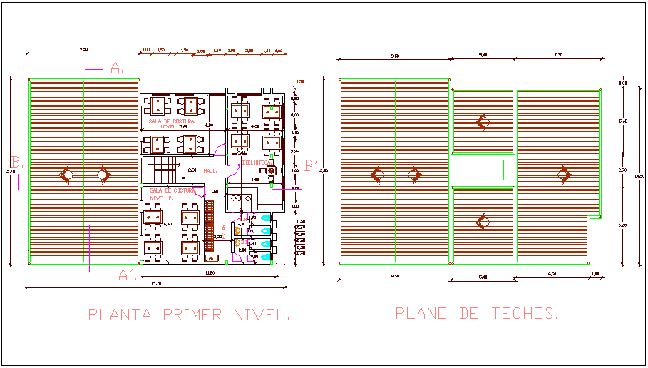 library,sewing room,washing area with necessary dimension and roof plan with wall and roof view of city hall.