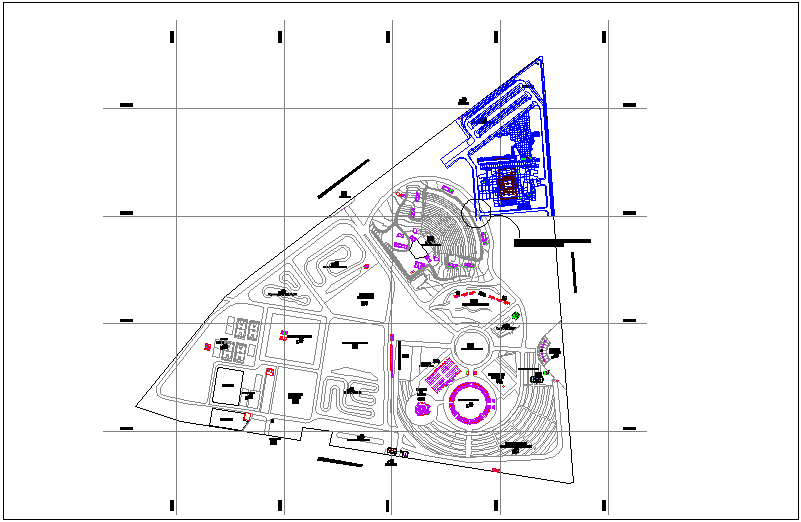 Location of cultural center dwg file in plan with area distributions and different area view of cultural center in location.