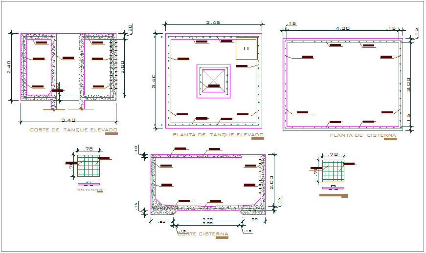 Construction plan and section view of tank for municipal building dwg file in tank plan with concrete view,wall view,single line view of water,tank top and tank cover with elevation and plan with necessary dimension.