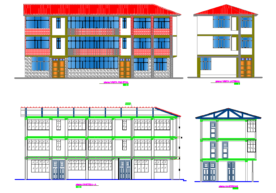 Elevation working detail dwg file, Elevation working detail with dimension detail, naming detail, front elevation detail, back elevation, landscaping detail with plant and tree detail, furniture detail with door and window detail, etc.