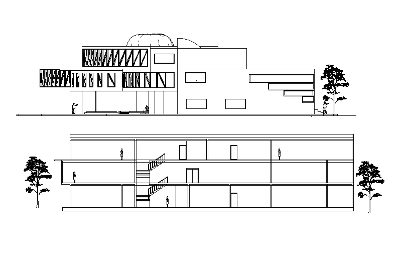Front elevation and back elevation detail dwg file, Front elevation and back elevation detail with landscaping with tree detail, etc.