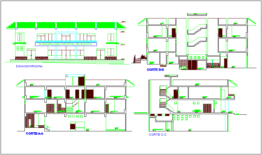 Elevation and section view of municipal building dwg file in elevation with wall,floor,door,