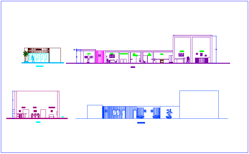 Elevation and section view with different axis of community center dwg file