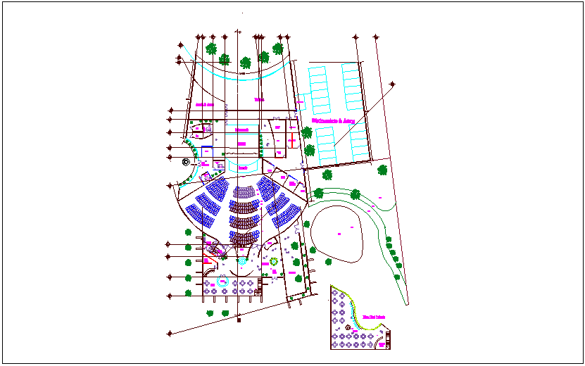 Theater of 350 spectators plan dwg file in plan with area distribution and road view,tree view,