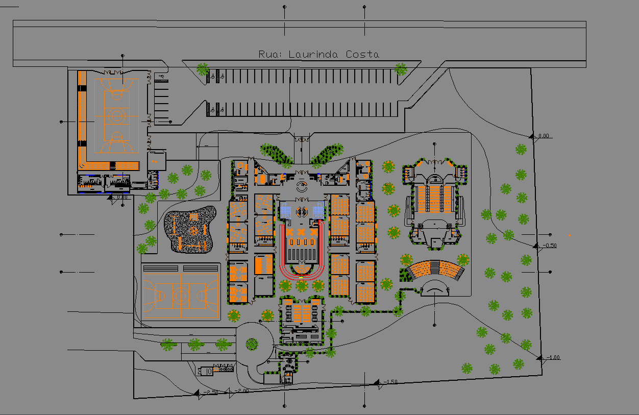 This school project DWG presents a complete educational campus layout featuring classroom blocks, administrative zones, landscaped courtyards, and well-defined circulation paths. The drawing includes detailed plans for academic wings, staff rooms, principal cabin placement, student activity areas, and interior zoning. Each sheet shows precise measurements, entrance orientation, sports courts, playground spacing, and building access points. The plan also highlights structured parking areas, drop-off zones, green buffers, and interconnected pathways laid out to support smooth campus movement.