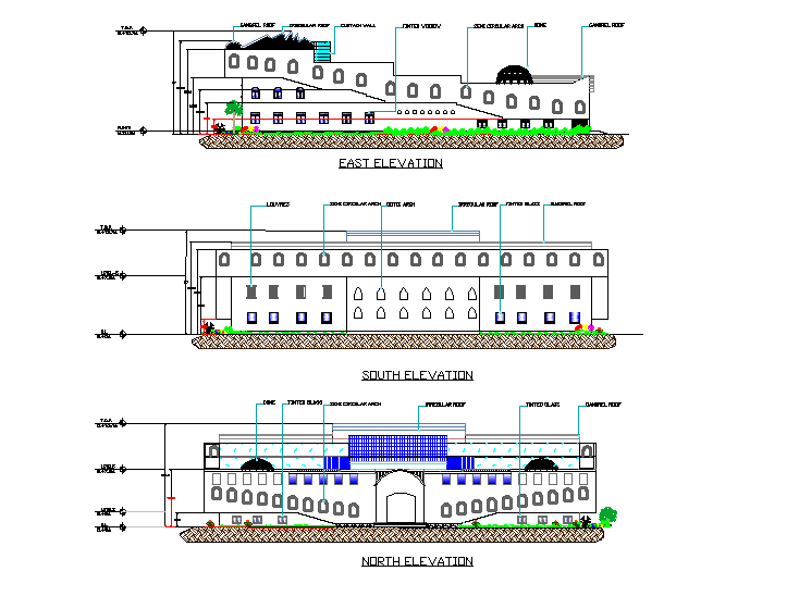 Elevation working detail dwg file, Elevation working detail with dimension detail, naming detail, east elevation detail, south elevation, north elevation, center line plan, main gate elevation detail, plinth level detail, etc.