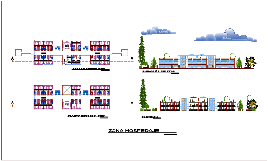 Hosting area plan,elevation and section view of youth development center dwg file in plan