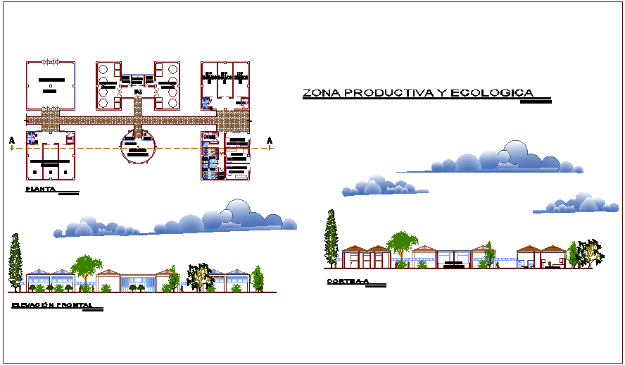 Productive and ecological area plan,elevation and section view for youth development center dwg file