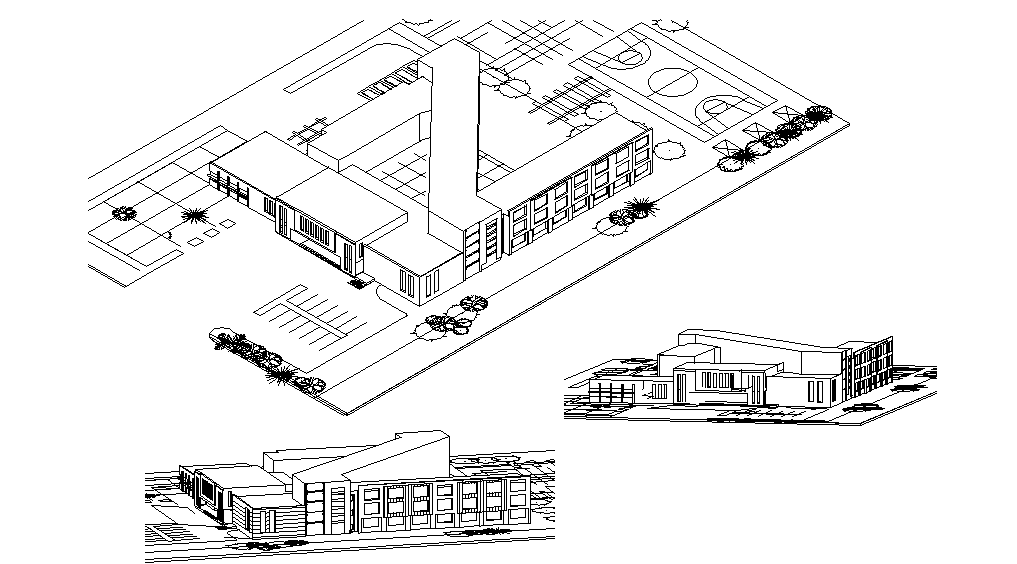 3 D commercial elevation detail dwg file, 3 D commercial elevation detail with furniture detail with door and window detail, landscaping detail with tree detail, front elevation detail, side elevation detail, back elevation detail, etc.