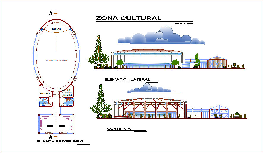 Cultural zone plan,elevation and section view for youth development center dwg file