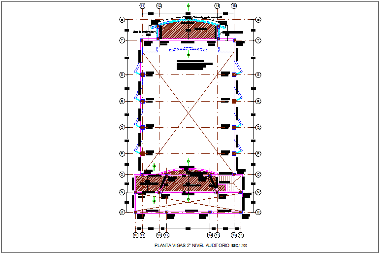 Second level auditorium beam plan for integral center dwg file in plan with area distribution