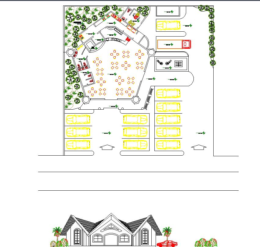 This restaurant design drawing presents a unique circular floor layout that organizes seating areas, bar counters, service counters, and movement pathways with clarity. The ground floor includes the main dining area arranged around a central axis, creating an open and symmetrical environment that enhances guest flow and visual appeal. The outdoor parking layout is carefully planned with marked vehicle bays and clear access routes, ensuring efficient circulation. Additional elements such as landscaped zones and entrance pathways offer an aesthetically pleasing arrival experience for guests.