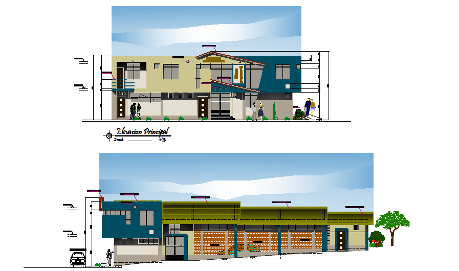Elevation working detail dwg file, Elevation working detail with dimension detail, naming detail, front elevation detail, back elevation detail, furniture detail with door and window detail, landscaping detail with tree and plant detail, plinth level detail, etc.