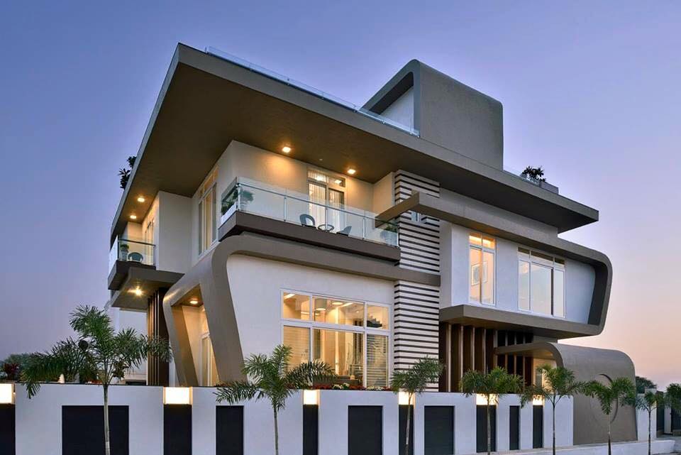 This modern bungalow 3D design package showcases a premium architectural model featuring bold massing, extended cantilevered roof slabs, and large glazed openings that provide a visually striking contemporary look. The rendered model presents a multi-level elevation with curved façade elements, vertical fins, recessed lighting, handrail-mounted terraces, and structural projections. The front elevation includes floor-to-ceiling windows, balcony glass railings, and detailed wall textures that highlight material contrast. The design incorporates expressive geometry, combining sharp edges with smooth curves, visible shading elements, and an integrated boundary wall layout as seen in the preview.