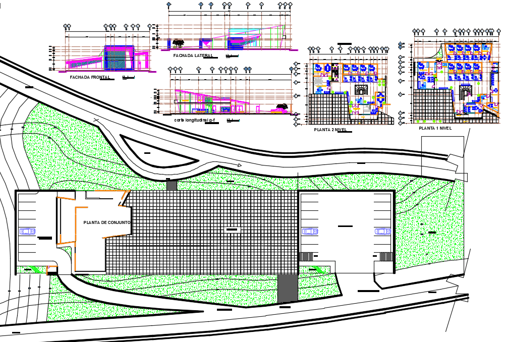Office working plan detail dwg file, Office working plan detail with dimension detail, naming detail, center line plan detail with numbering detail, cut out detail, landscaping detail with tree detail, car parking detail, etc.