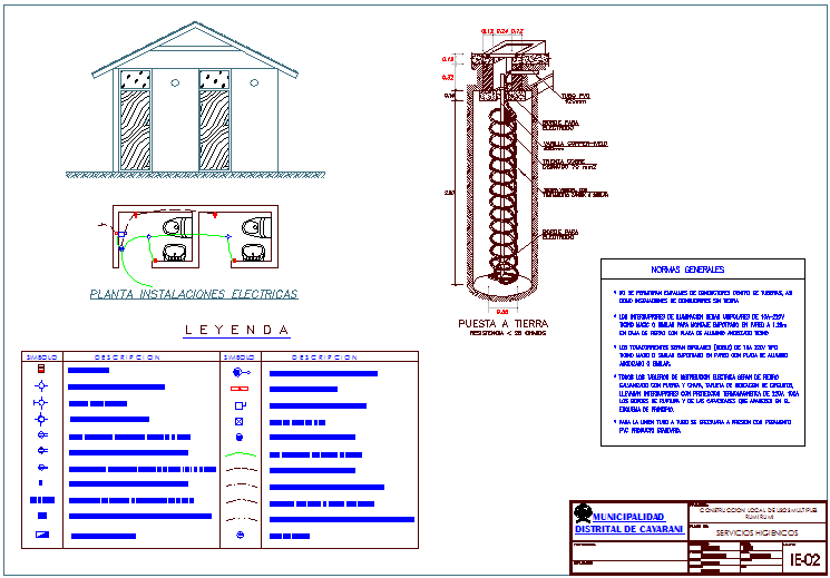 Electrical installation view with its legend for hygienic area of multiple use dwg file in plan with view of area distribution,electric line view,electric point view,electrical legend view with detail and grounding view.