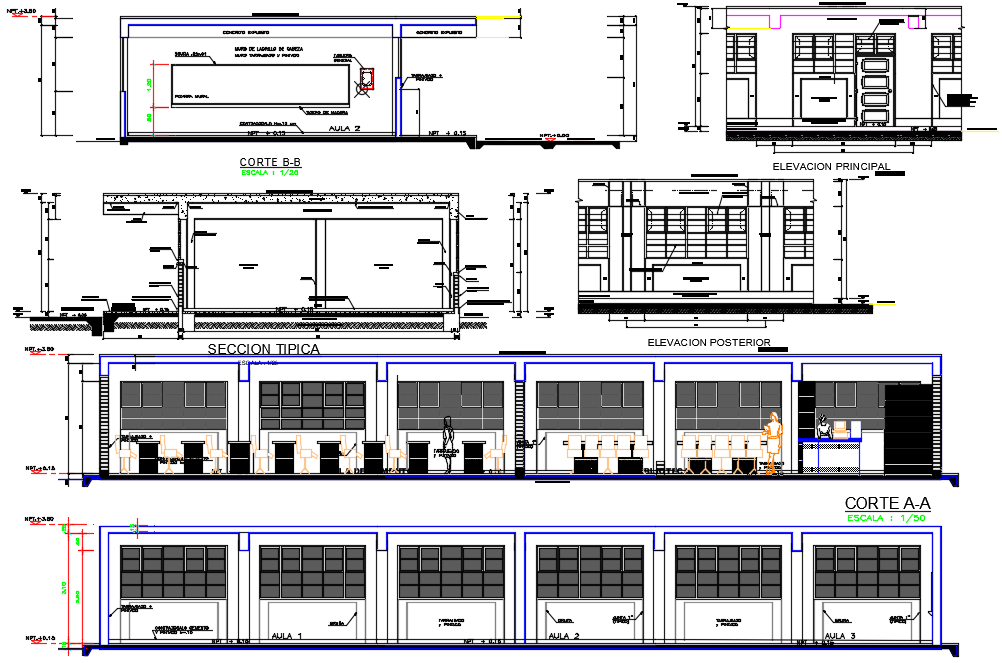 Elevation and section wall detail dwg file, Elevation and section wall detail with naming detail, dimension detail, front elevation detail, side elevation detail, back elevation detail, section A-A’ detail, section B-B’ detail, foundation detail, stair cutting detail, etc.