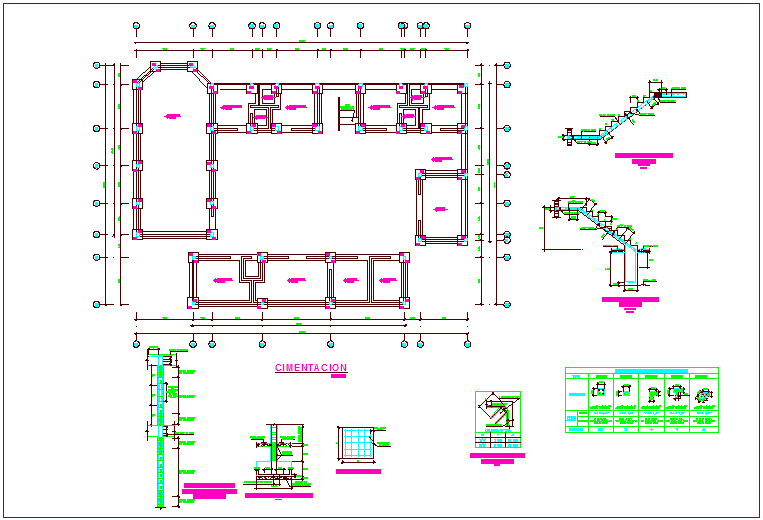 Foundation plan with construction detail of community center dwg file