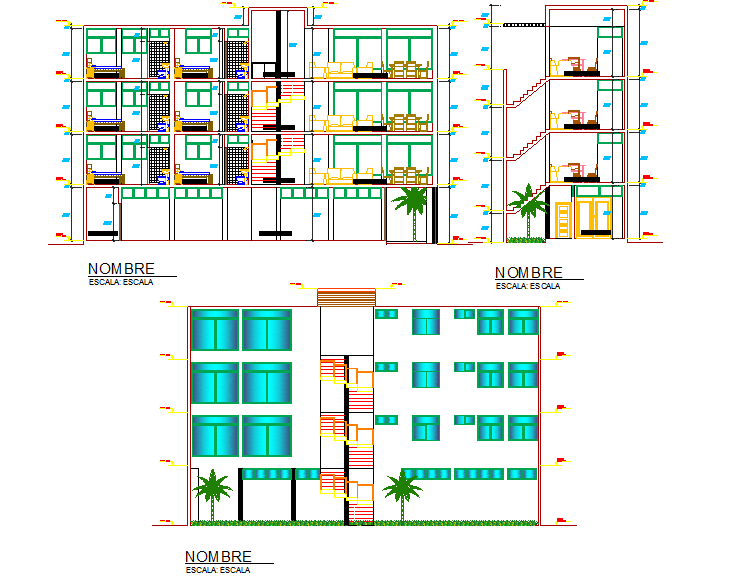 Elevation and section detail dwg file, Elevation and section detail with dimension detail, naming detail, furniture with chair, door, window and table, balcony detail, reeling detail, front elevation detail, section A-A’ detail, etc.