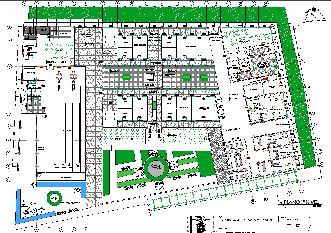 This Modern Shopping Mall Design DWG file provides a fully detailed architectural layout with accurate measurements for commercial planning and presentation. The drawing includes a complete site arrangement featuring parking areas, vehicular circulation, landscaped edges, lobby zones, retail kiosks, individual shop blocks, food court areas, staircases, lifts, emergency exits and toilet sections. The plan also highlights the structural grid, column arrangement, flooring patterns, wall partitions and mechanical zones, allowing designers to study practical zoning relationships and movement flow within an active mall environment.