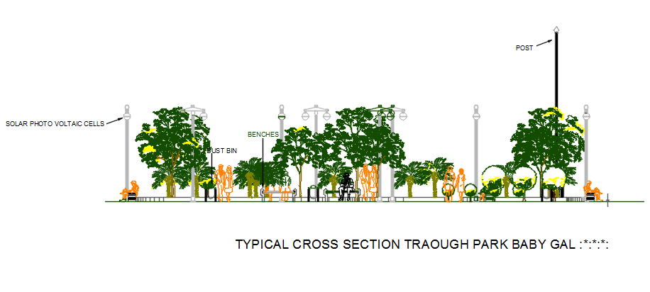 Front elevation detail dwg file, Front elevation detail with landscaping detail with plant and tree, light lamp detail, bench detail, etc.