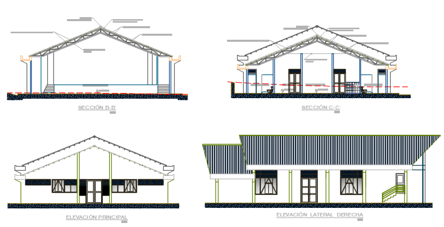 Elevation and section detail dwg file, Elevation and section detail with dimension detail, naming detail, font elevation detail, side elevation detail, section B-B’ detail, section C-C’ detail, stair cutting detail, etc.