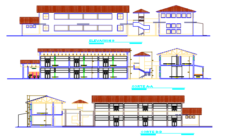 Elevation and section detail dwg file, Elevation and section detail with dimension detail, naming detail, font elevation detail, section A-A’ detail, section B-B’ detail, stair cutting detail, roof elevation detail, etc.