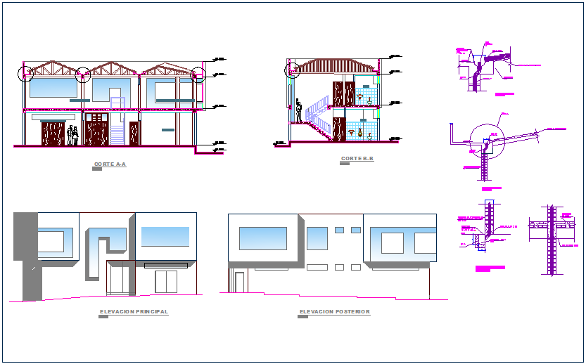 Elevation and different axis section view for multi use center dwg file in elevation with view of
