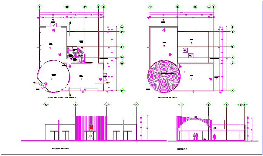 Architectural floor plan with roof plan,elevation and section view of multi purpose use hall dwg file