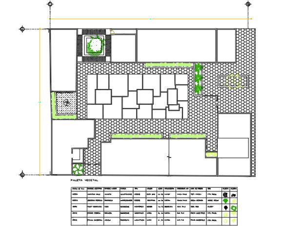 landscaping plan with detail of paving, different plantation &vegetation detail with measurement and name detail