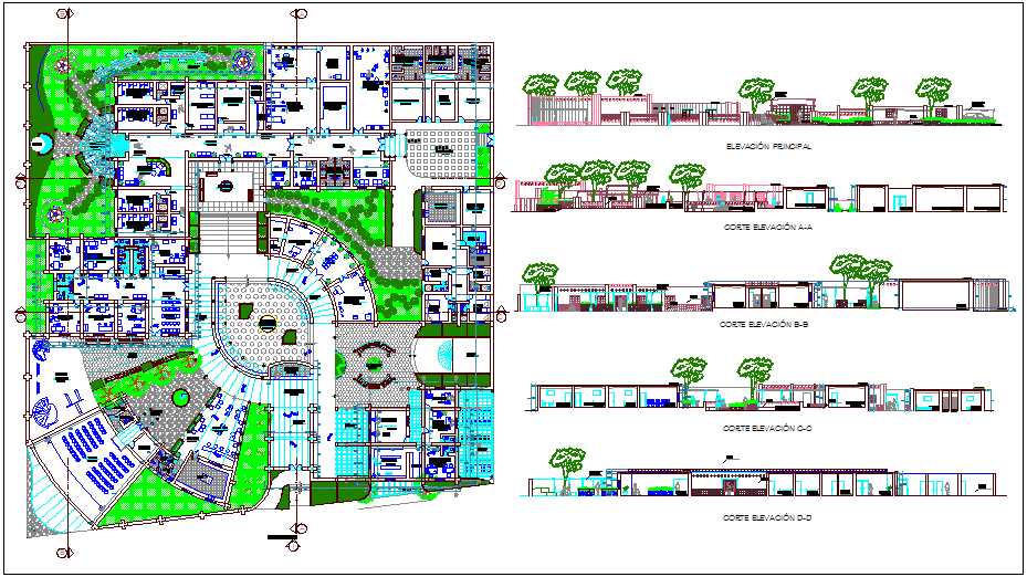 Landscape view with elevation and section view of clinic dwg file in landscape view with view of road and tree view,entry way,information area,hall,different consultant room,patient room,