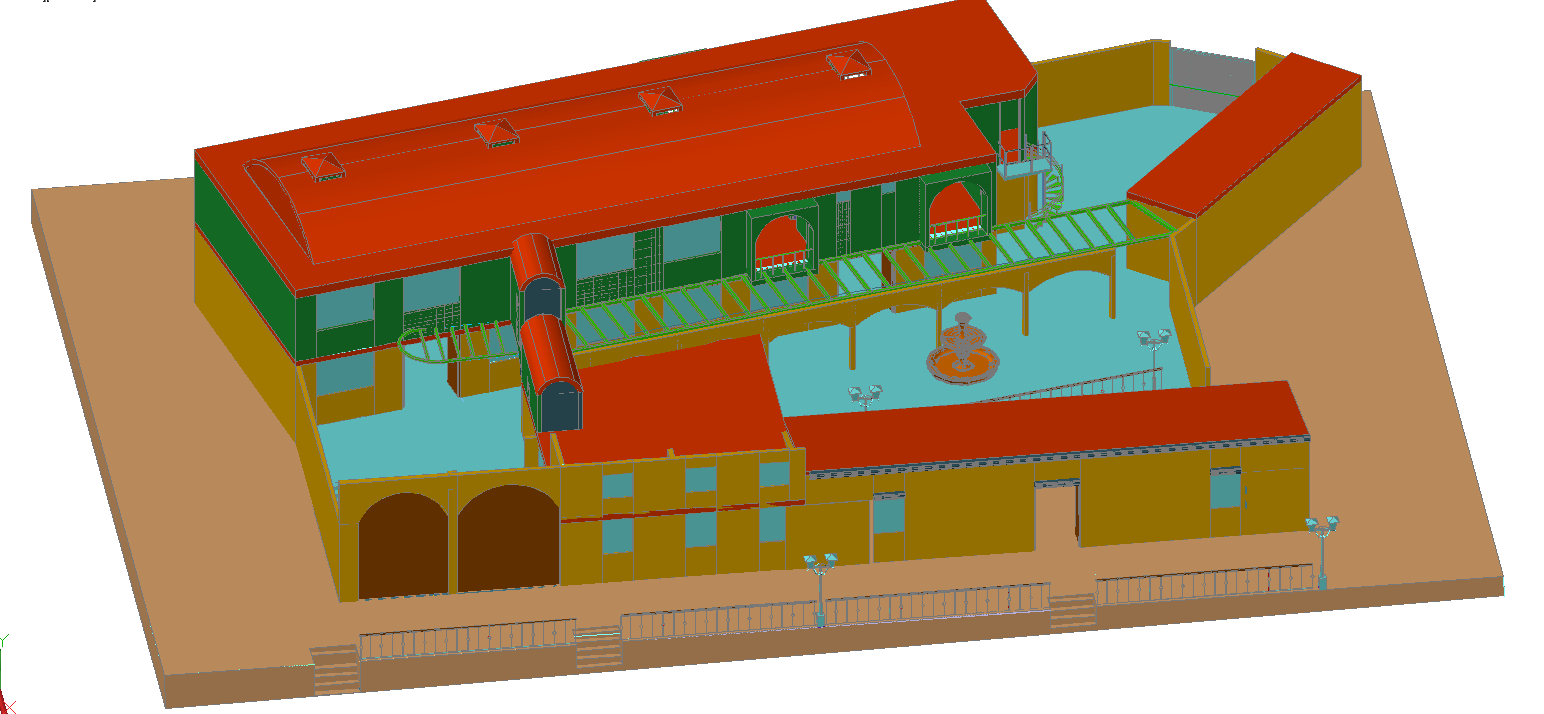 The 3D model illustrates secondary structures, outdoor stairways, covered connectors, entry passages and landscaped placement around the boundary. Wall finishes, shading projections, façade openings and balcony transitions are clearly represented for realistic visualization. This DWG file is ideal for architects, civil engineers, interior designers and builders who require accurate 3D bungalow references for visual presentation, planning development and construction detailing. The combination of large roof spans, articulated corridors and courtyard massing makes this model suitable for residential design studies and advanced 3D planning workflows.