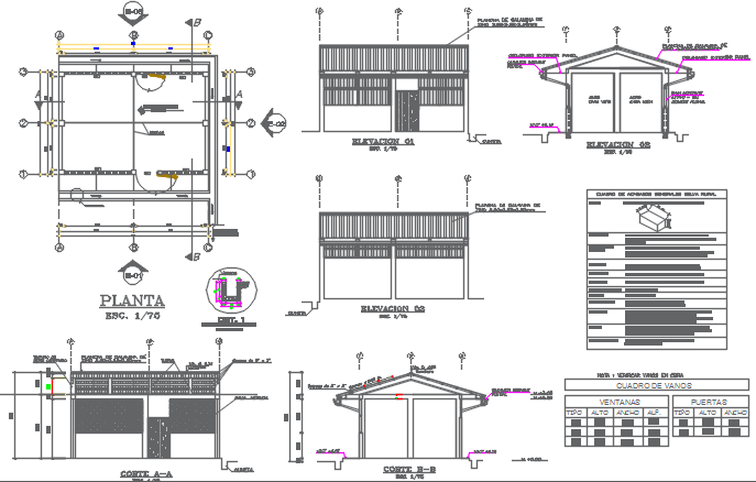 Plan, elevation and section working plan detail dwg file, including roof section detail, center line plan detail with numbering detail, table detail, front elevation detail, left elevation detail, back elevation detail, section A-A’ detail, section B-B’ detail, etc.