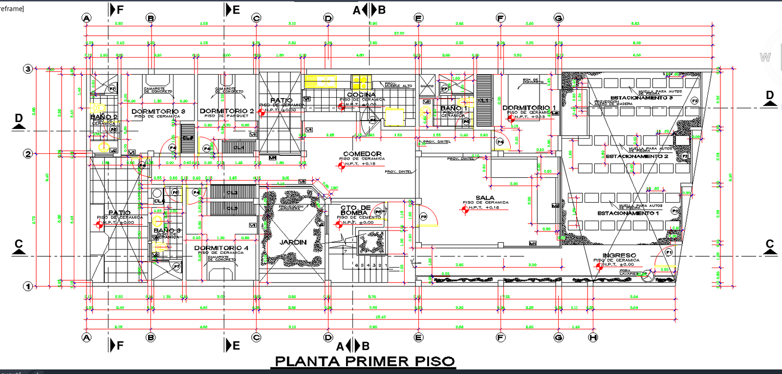 This modern house design DWG file features a complete architectural layout with a 12m structural grid and detailed planning across the ground floor, first floor, and second floor. The drawing includes the living room, dining area, kitchen layout, bedroom arrangements, and sanitary spaces with accurate measurements. Each level is drafted with precise dimensioning, column placement, beam positions, and door–window schedules, ensuring clarity for both architects and civil engineers. The plan also includes electrical layouts, plumbing routing, and load-bearing wall distribution for efficient execution during construction.