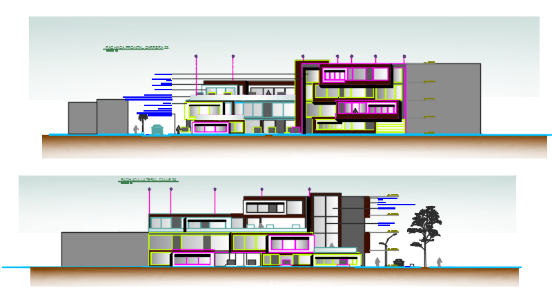 Front elevation and back elevation plan detail dwg file, with furniture detail door and window detail, main gate detail, landscaping detail with plant and tree detail, stair detail, etc.