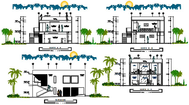 Elevation and section detail dwg file, with dimension detail, naming detail, front elevation detail, back elevation detail, section A-A’ detail, section B-B’ detail, furniture detail with door and window, roof elevation detail, etc.