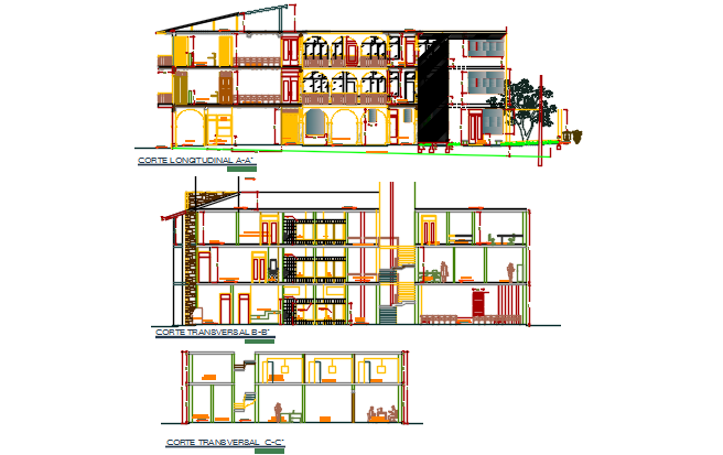 Section detail dwg file, dimension detail, naming detail, section A-A’ room cutting detail, section B-B’ door and window cutting, section C-C’ detail, roof section detail, stair cutting detail, etc.