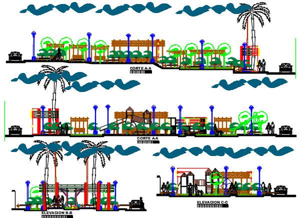 Elevation and section detail dwg file, Elevation and section detail with dimension detail, naming detail, elevation B-B’ detail, elevation C-C’ detail, section A-A’ detail, section B-B’ detail, furniture detail with door and window, street light detail, landscaping detail with tree and plant detail, etc.